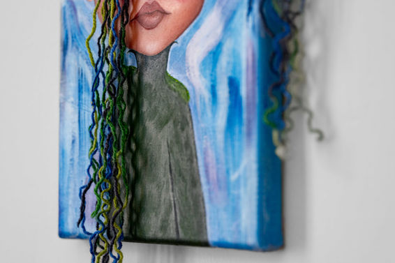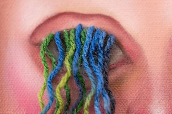 Sipario is a painting-installation that plays with the boundary between painting and object, between stage and backstage. The central figure, with its absent gaze and long eyelashes made of colored threads, evokes the idea of a theater curtain opening, intimately revealing itself.